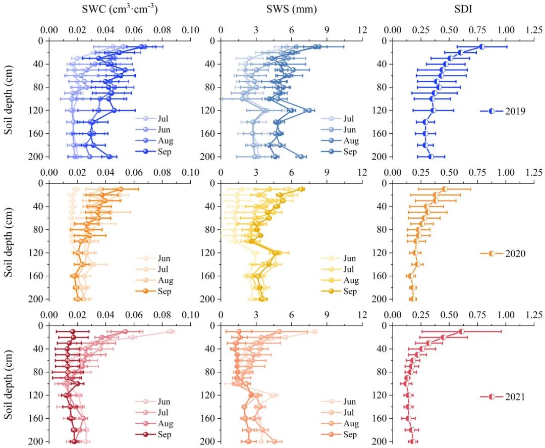 图2. 三个水文年(2019–2021年)沙柳林土壤含水量(SWC)、土壤储水量(SWS)和土壤干燥化指数(SDI)的变化。误差线表示标准误差。