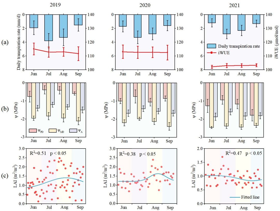 图3. 2019-2021年生长季沙柳平均日蒸腾速率(T)、固有水分利用效率(iWUE)、叶水势(Ψ)和叶面积指数(LAI)的变化。误差线表示标准误差。
