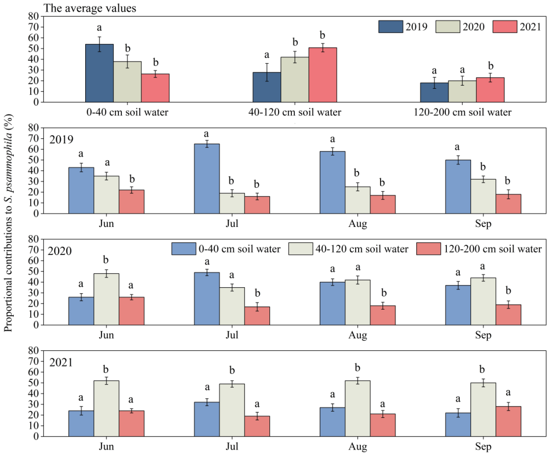 图4. 三个水文年(2019–2021年)不同土层(0–40 cm、40–120 cm、120–200 cm)土壤水分对沙柳的贡献比例。误差线表示标准差。